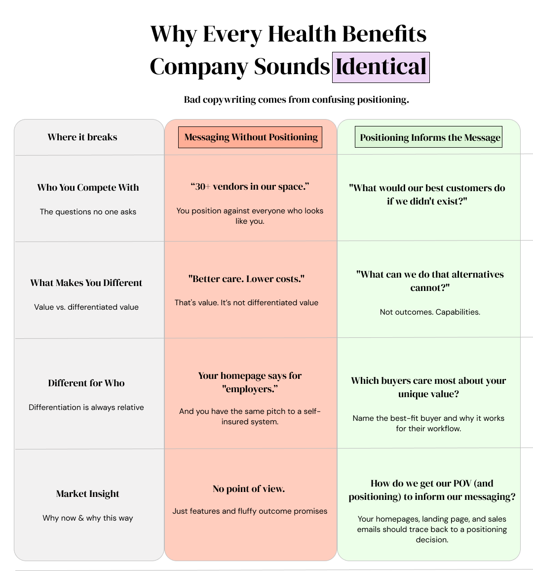 An example is a healthcare benefits startup that says the same thing as everyone else instead of asking the right questions.